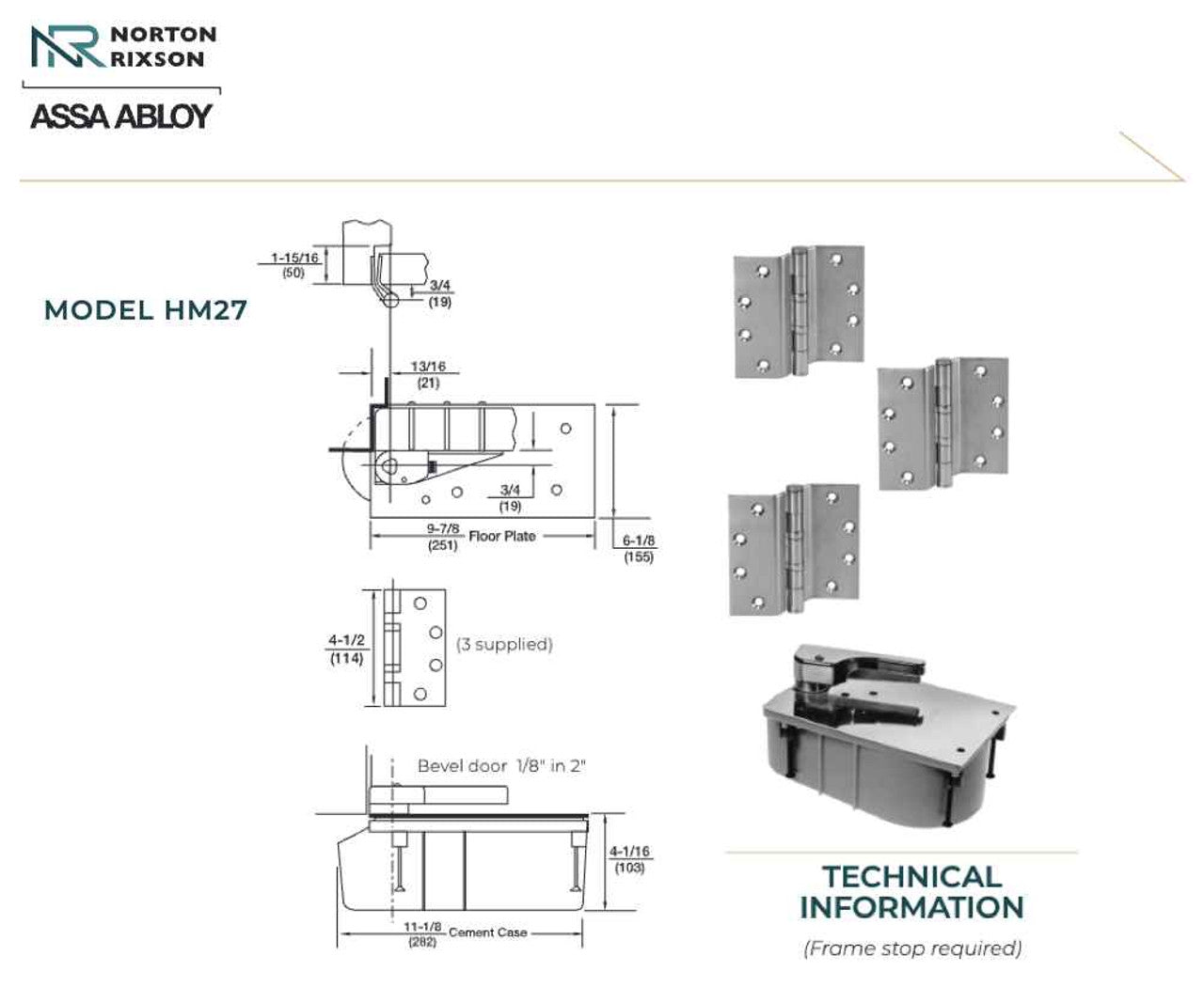 The Norton Rixson HM27 Series is a 3/4" offset-hung floor closer designed for 1-3/4" hollow metal door and frame installation for interior or exterior doors weighing up to 250lbs.