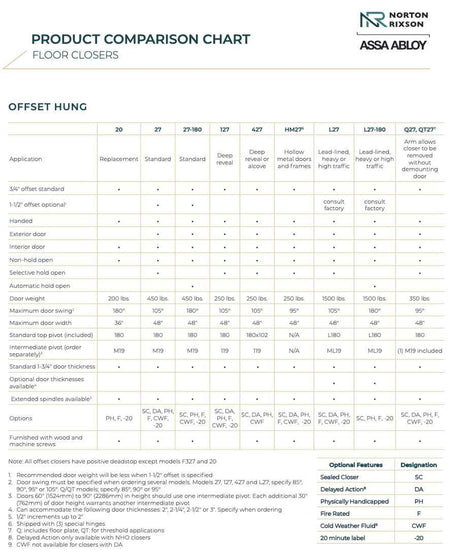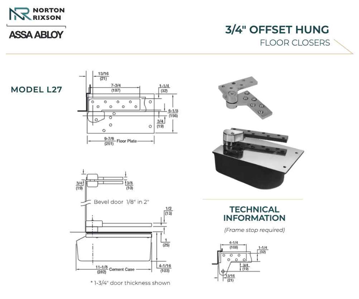 The Norton Rixson L27 Series is a 3/4" offset-hung floor closer designed for heavy door weights and high traffic use on lead-lined interior or exterior doors weighing up to 1500 lbs.