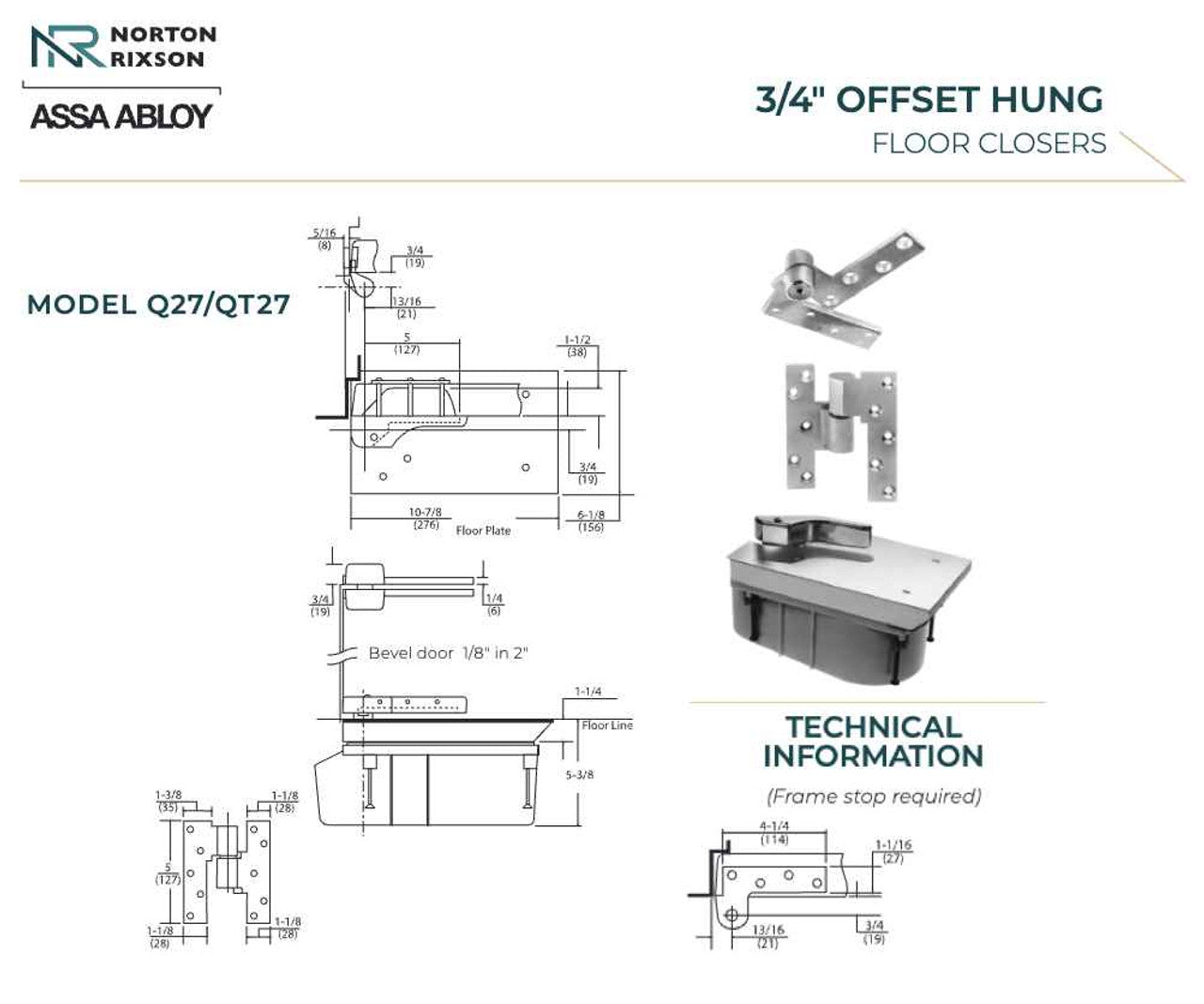 The Norton Rixson Q27/QT27 Series is a 3/4" offset-hung floor closer designed for 1 3/4" door frame installation for interior or exterior doors weighing up to 350lbs.
