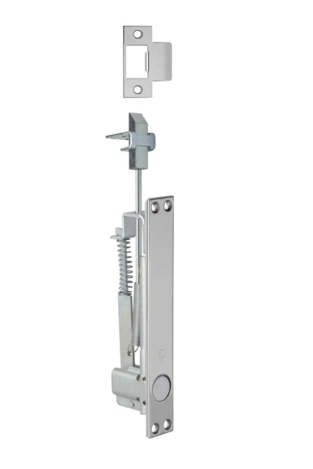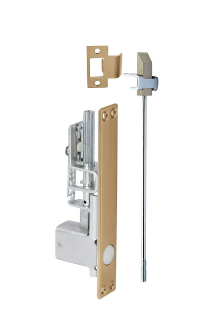 The 2805 Combination Flush Bolt (Self Latching Top Bolt Only) is for use on select fire rated metal doors. This product automatically engages when the inactive door closes, and when the active door is opened, the inactive door stays latched at the top until the top bolt is released by pressing the plunger button on the bolt face.