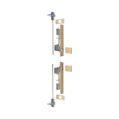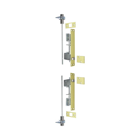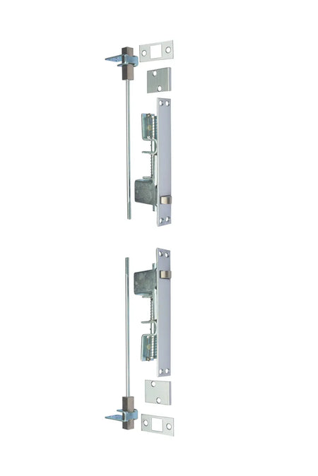 The non-handed, fully automatic 2842 Automatic Flush Bolt Set (top and bottom bolts) is for select fire rated metal door types. This set's override feature prevents damage to doors or bolts if bolt heads are blocked from entering strikes, while its thermal lock automatically locks the inactive door under high heat conditions due to fire.