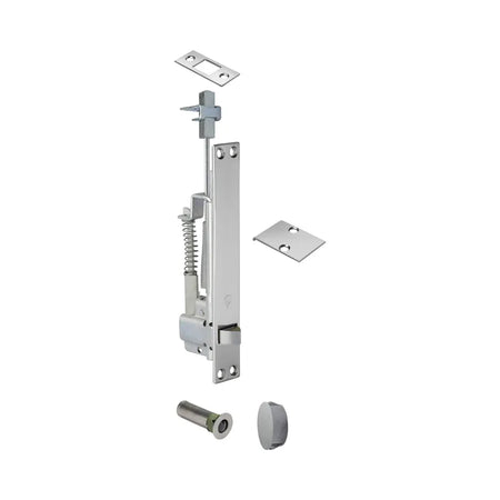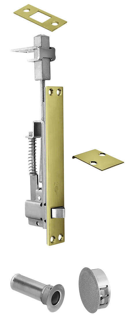 The fully automatic 2848 Automatic Flush Bolt with Bottom Fire Bolt is for use on select fire rated metal doors. This product features low closing force, an override feature that prevents damage to doors or bolt if bolt head is blocked from entering strike, and a thermal lock that automatically locks the inactive door under high heat conditions due to fire. The bottom fire bolt eliminates the need for floor prep and its oversized fire bolt strike hole allows for slight door misalignment.