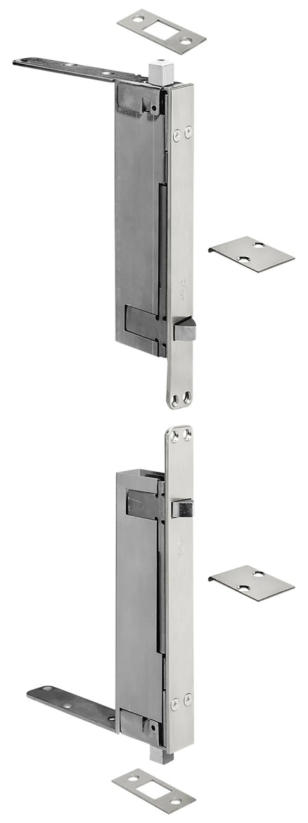 The non-handed, fully automatic 2942 Automatic Flush Bolt Set (top and bottom bolts) is for select wood door types and includes an override feature that prevents damage to doors or bolts if bolt heads are blocked from entering strikes, as well as a thermal lock that automatically locks the inactive door under high heat conditions due to fire.