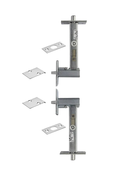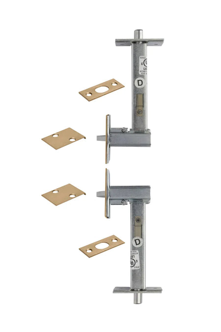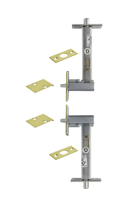 The durable, small profile 2962 Automatic Flush Bolt Set (top and bottom bolts) is for select fire rated wood core & composite doors. This easy-to-prep, non-handed set is fully automatic and features quiet and smooth activation, low closing force, and an override feature that prevents damage to doors or bolt if bolt head is blocked from entering strike.