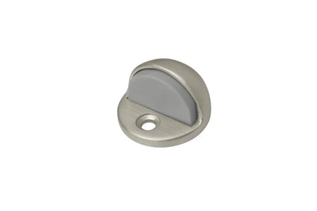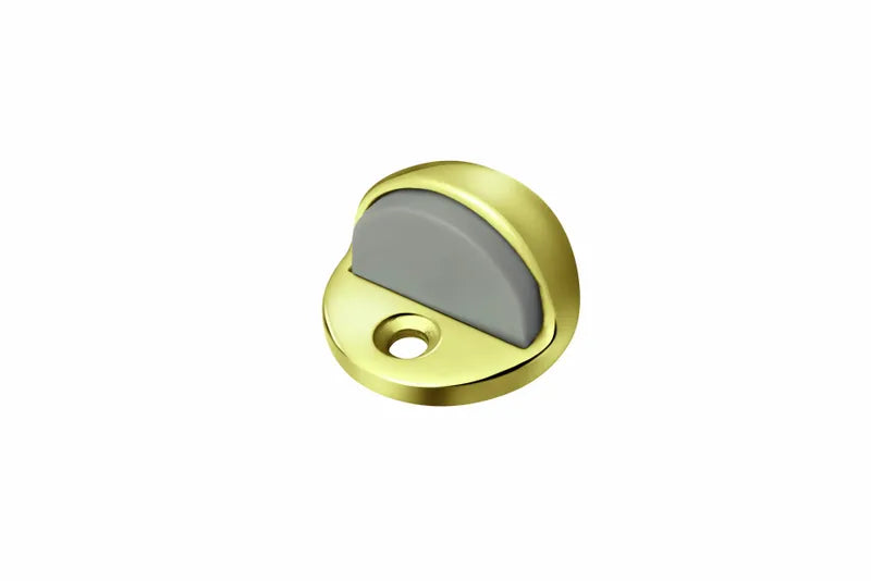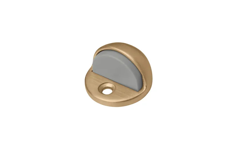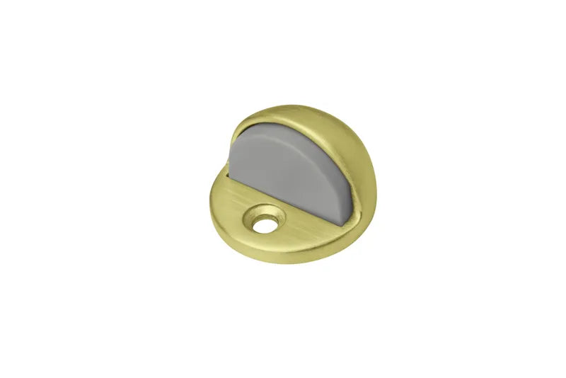 The 441 Cast Brass Low Dome Floor Mounted Door Stops, equipped with rubber bumpers, are designed for doors without thresholds (non-undercut) to effectively prevent them from swinging too far.