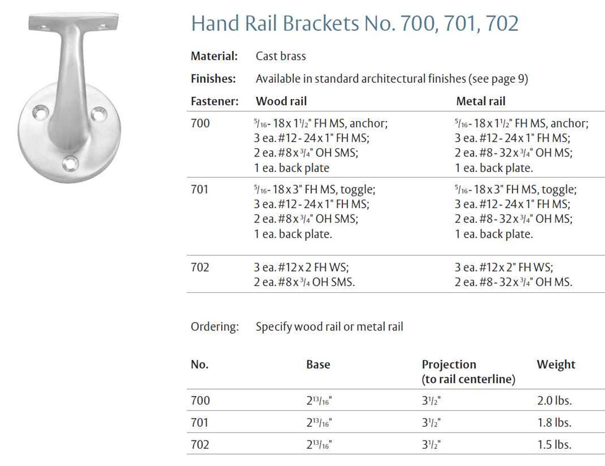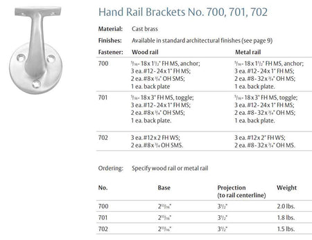 The cast brass 700, 701, and 702 Hand Rail Brackets are expertly designed to provide sturdy support for both wood and metal handrails. These brackets offer a reliable and attractive solution for a variety of handrail applications.