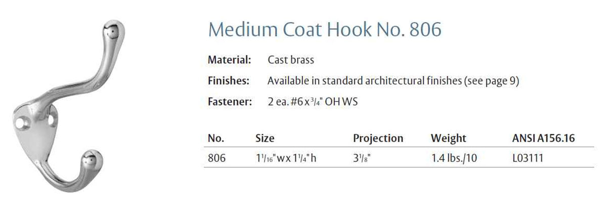 The 806 Medium Double Cast Brass Coat Hook features two hooks to accommodate multiple hanging items.