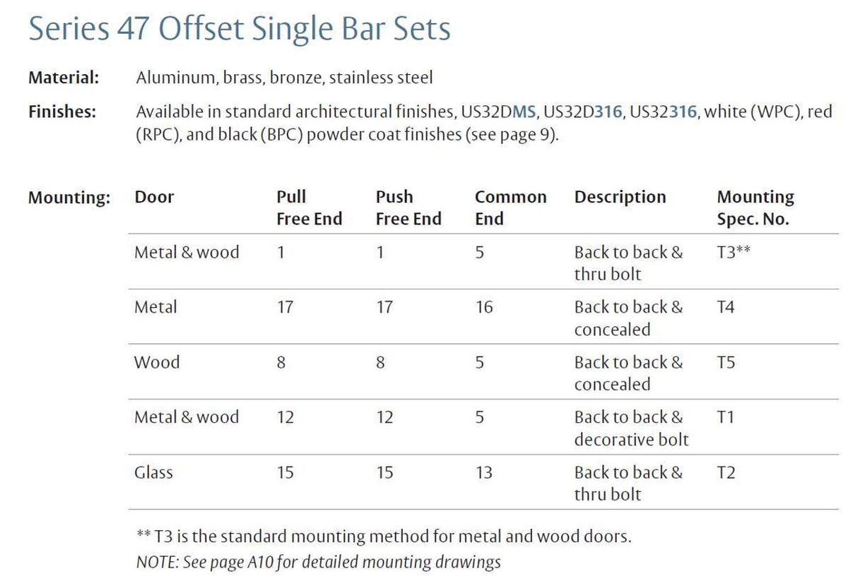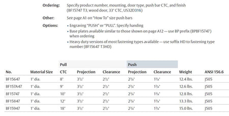 - Ordering: Specify product number, mounting, door type, push bar CTC, and finish (i.e., BF15647 T3, wood door, 33" CTC, US32D316)