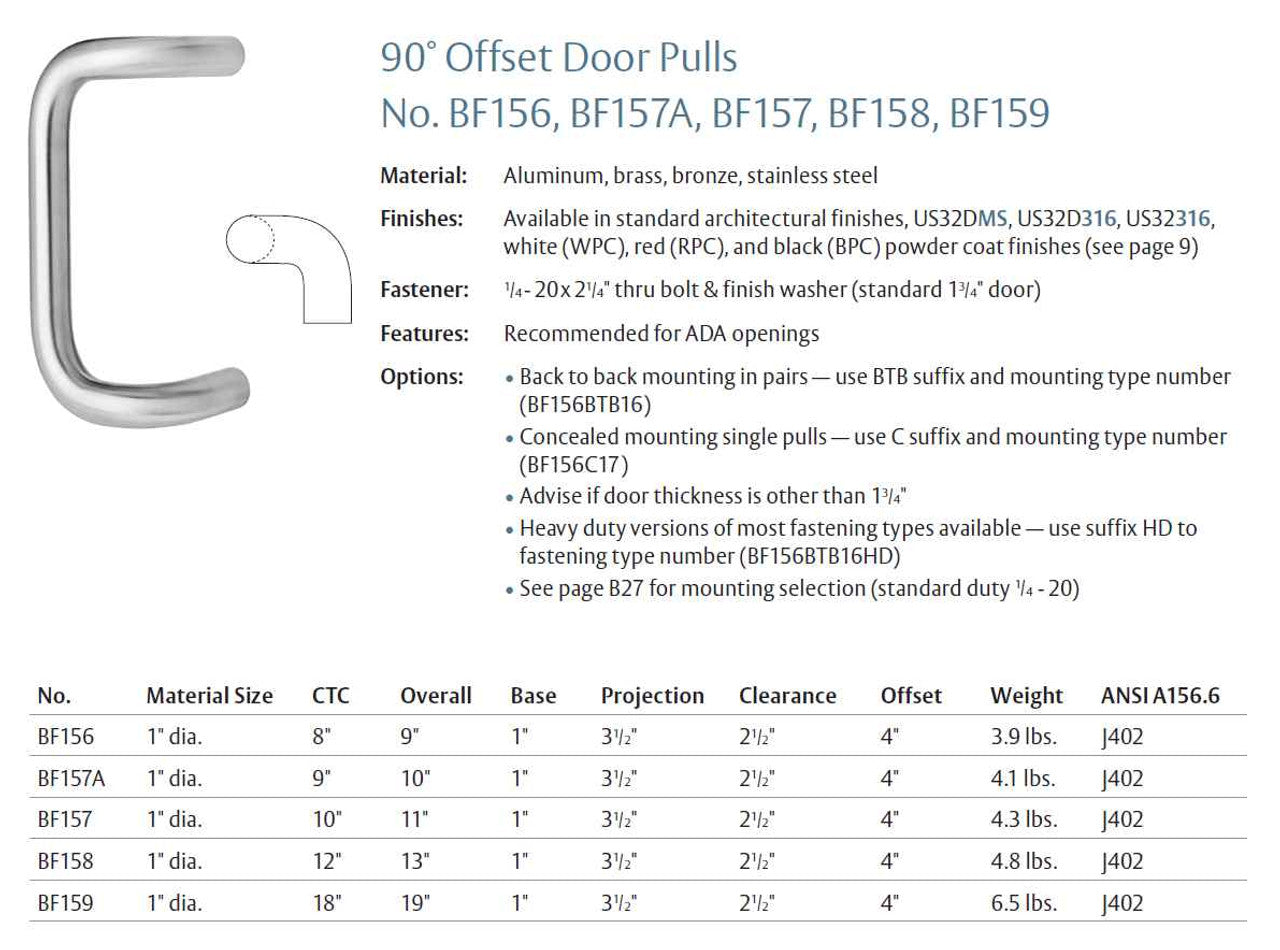 The BF158 90° Offset Door Pulls are recommended for ADA openings and feature back-to-back and concealed mounting options.