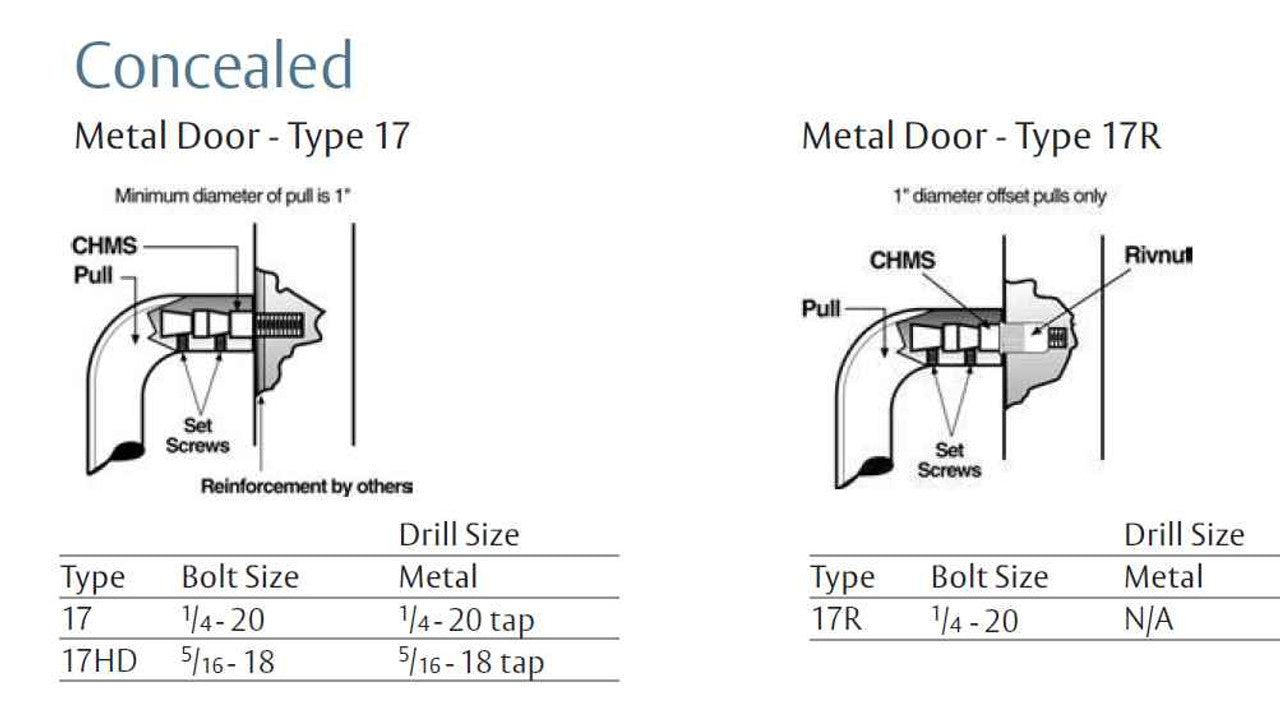 • Concealed mounting single pulls — use C suffix and mounting type number