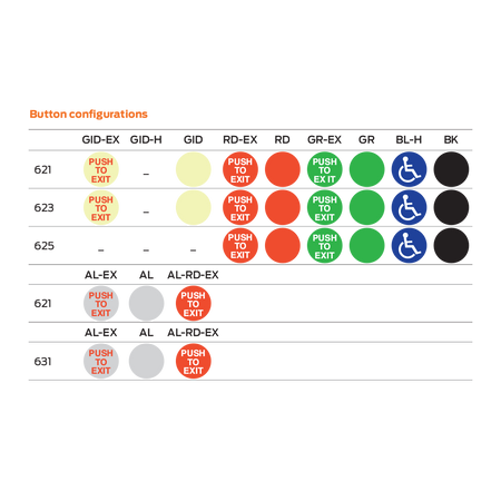 The 620 and 631 Series pushbuttons provide a wide selection of design options, finishes and messages. They are offered in narrow stile and standard width plates with multiple button configurations and finish options to provide enhanced architectural appeal.