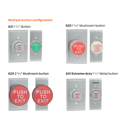 Schlage 620/631 Series heavy-duty pushbuttons are commonly used to control ingress and/or egress of a door. 620 and 631 Series come standard with a momentary switch but feature many factory orderable options including delayed or maintained action and narrow stile faceplates. Glow-in-the-dark and illuminated cone options on 621 and 623 models.