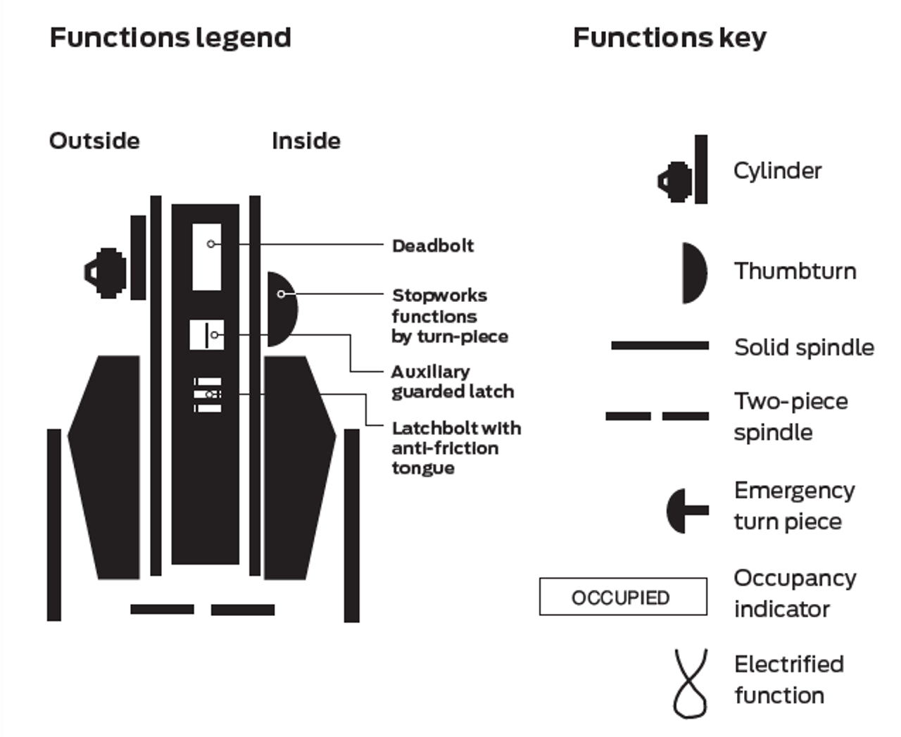 - Three mechanical functions offer optional key override of the inside thumbturn when it is being held in the locked position to stop unwanted barricade situations