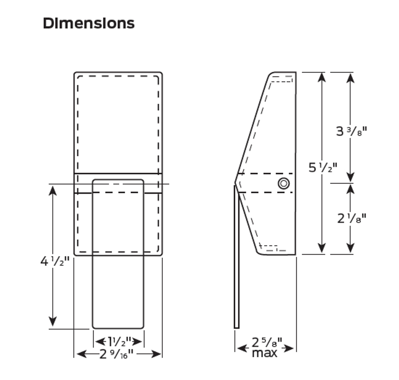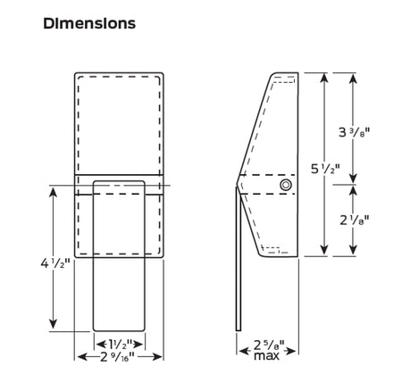 - Dimensions: body 2 9⁄16” x 5 1/2” (65 mm x 140 mm); paddle 1 1/2" x 4 1/2" (38 mm x 114 mm); projection from door 2 5/8" (67 mm)