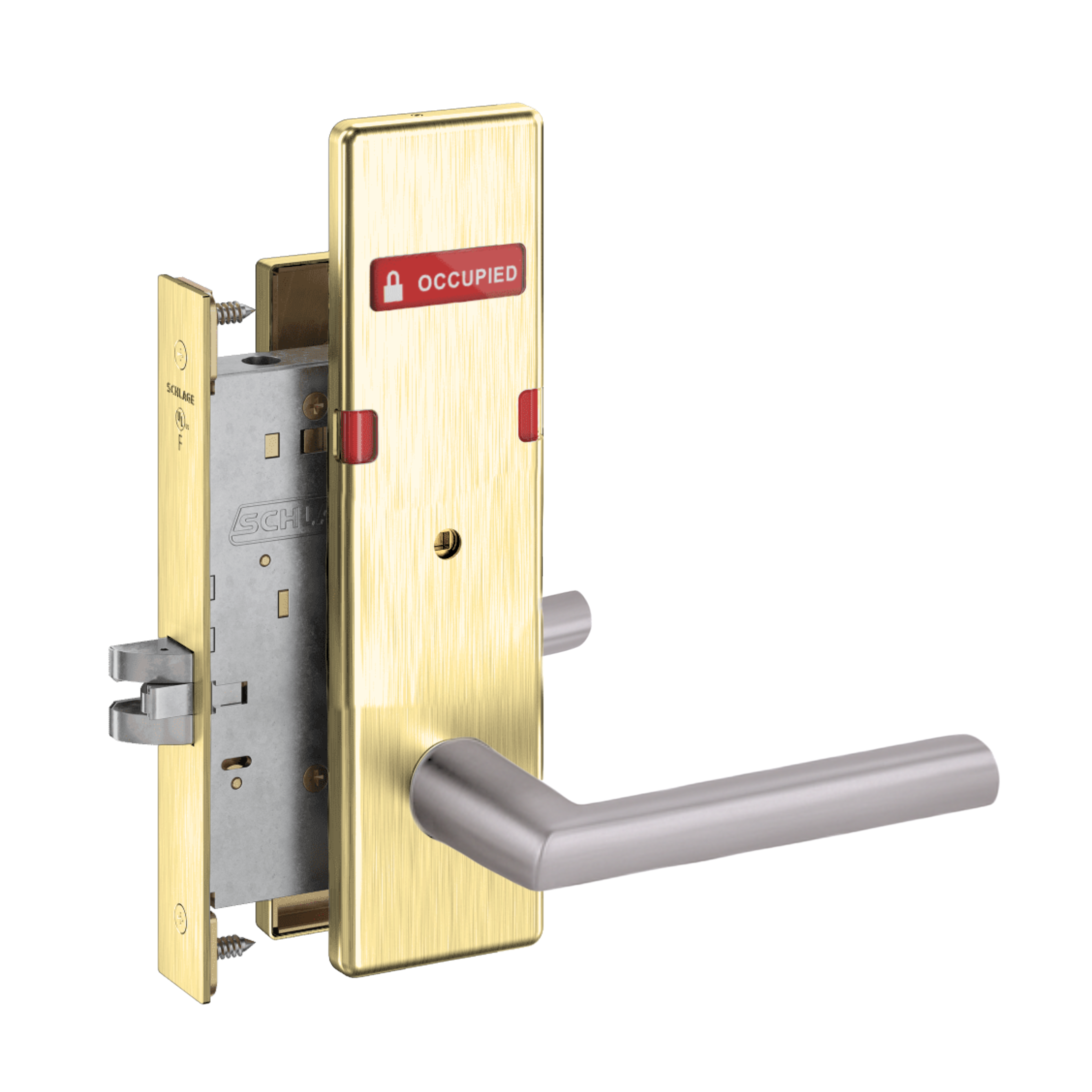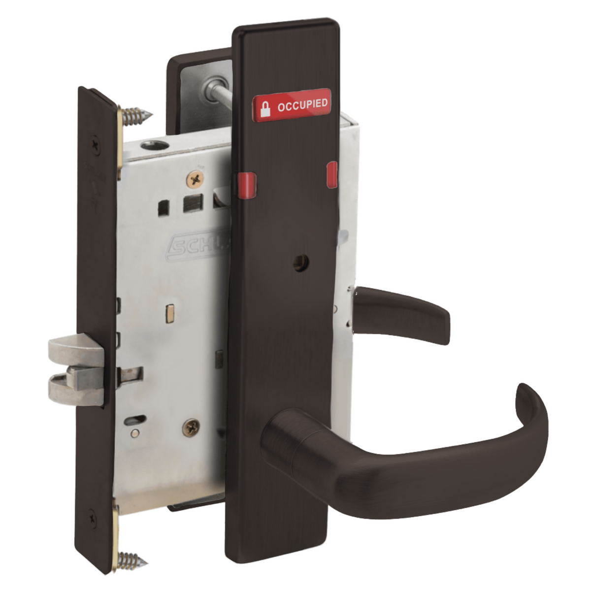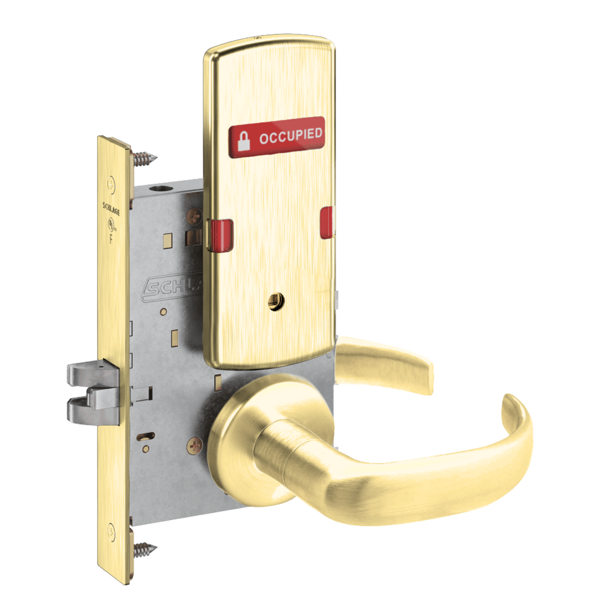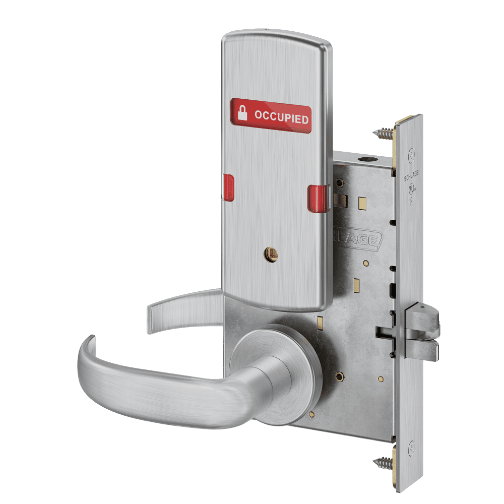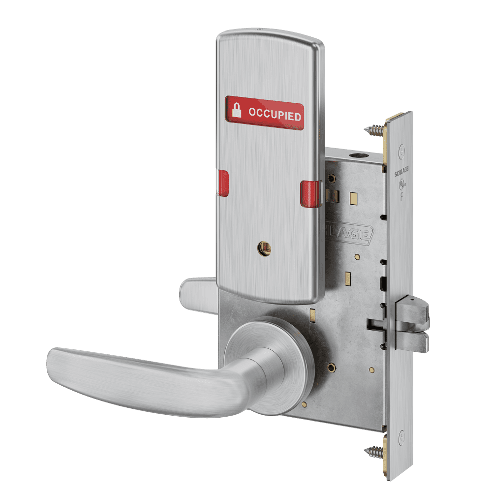 Schlage L9040 - Grade 1 Bed Bathroom Privacy Mortise Lock, Indicator displays with Text, Exterior Indicator displays "Vacant/Occupied"