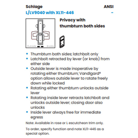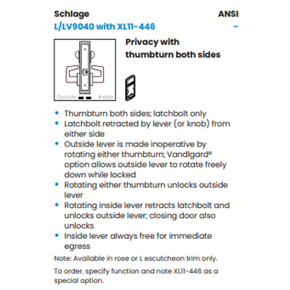 Schlage L9040 - Bath/Bedroom Privacy Lock With Turn Both Sides - Grade 1 Mortise Non-Keyed Lever Lock