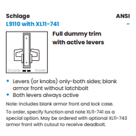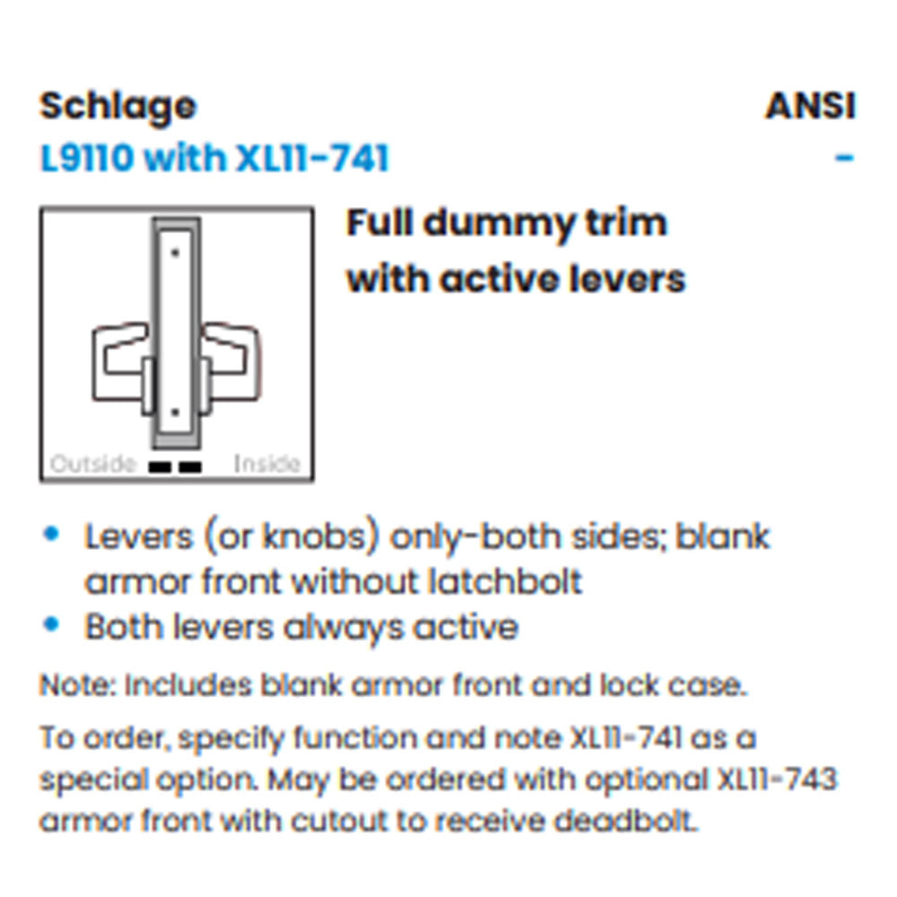 Schlage L9110 - Full Dummy Trim with Active Levers - Grade 1 Mortise Non-Keyed Lever Lock