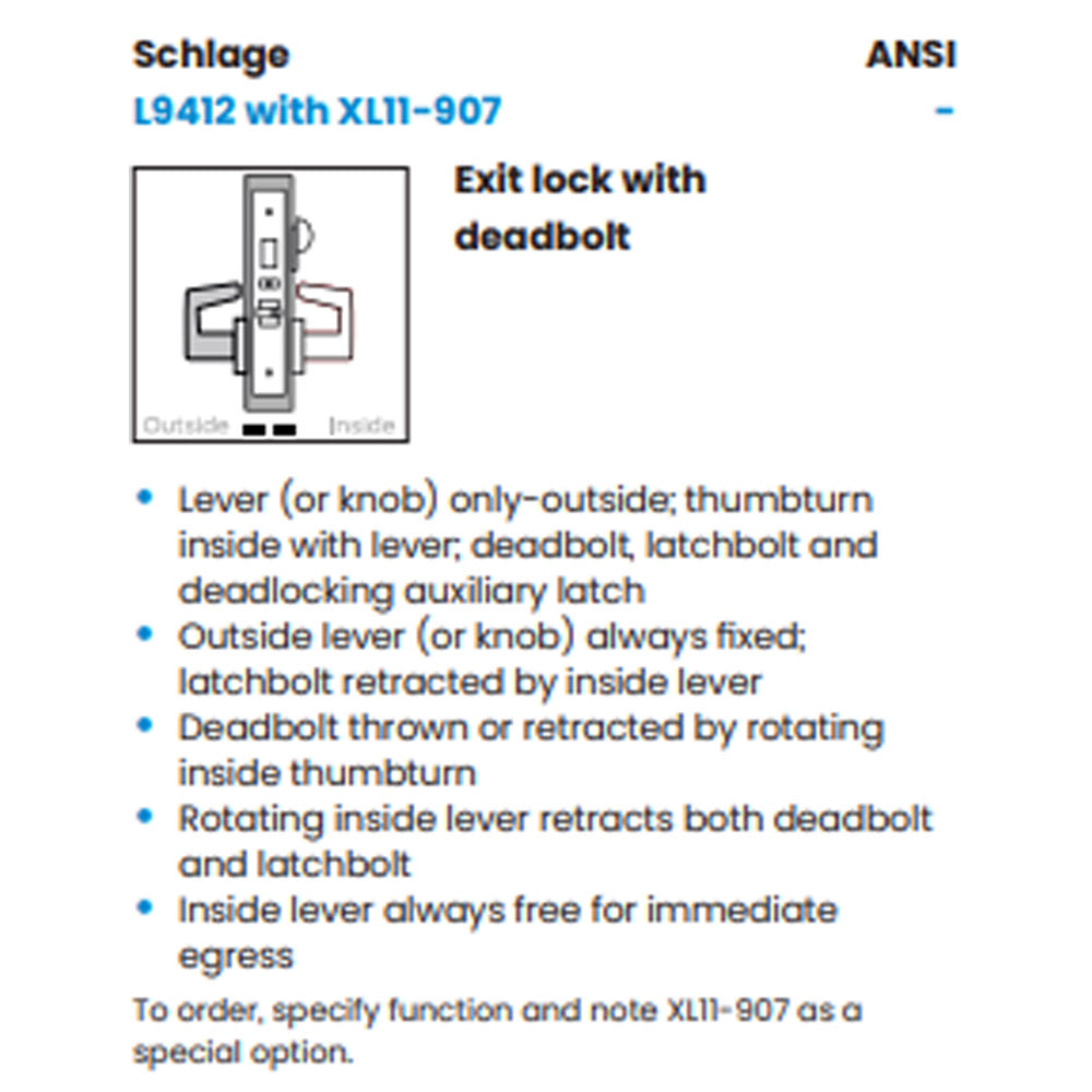 TITLE TAG: Schlage L9412 - Exit Lock with Deadbolt - Grade 1 Mortise Non-Keyed Lever Lock