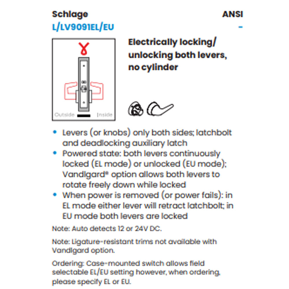 TITLE TAG: Schlage LV9091EL - Electrified Mortise Lock - Grade 1, Fail Safe, Outside Lever EL, No Cylinder Override, Request to Exit