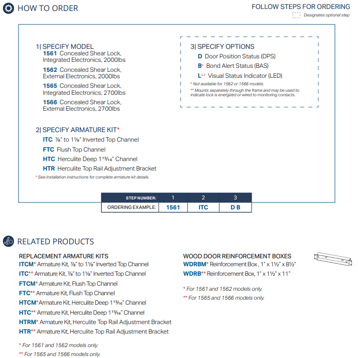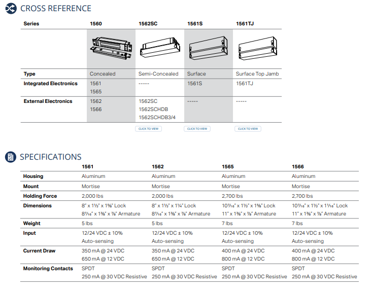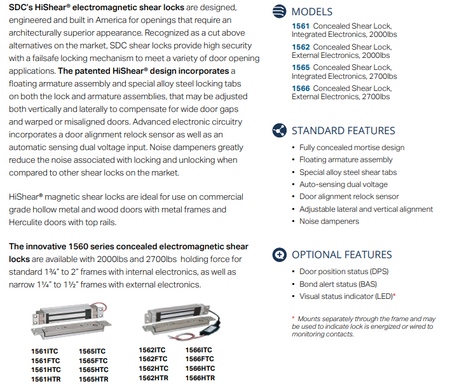 The innovative 1560 series concealed electromagnetic shear locks are available with 2000lbs and 2700lbs holding force for standard 13/4” to 2” frames with internal electronics, as well as narrow 11/4” to 11/2” frames with external electronics.