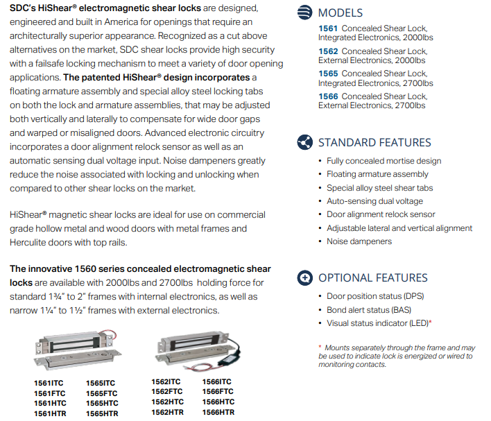SDC’s HiShear® electromagnetic shear locks are designed, engineered and built in America for openings that require an architecturally superior appearance. Recognized as a cut above alternatives on the market, SDC shear locks provide high security with a failsafe locking mechanism to meet a variety of door opening applications. The patented HiShear® design incorporates a floating armature assembly and special alloy steel locking tabs on both the lock and armature assemblies, that may be adjusted both vertically and laterally to compensate for wide door gaps and warped or misaligned doors. Advanced electronic circuitry incorporates a door alignment relock sensor as well as an automatic sensing dual voltage input. Noise dampeners greatly reduce the noise associated with locking and unlocking when compared to other shear locks on the market.