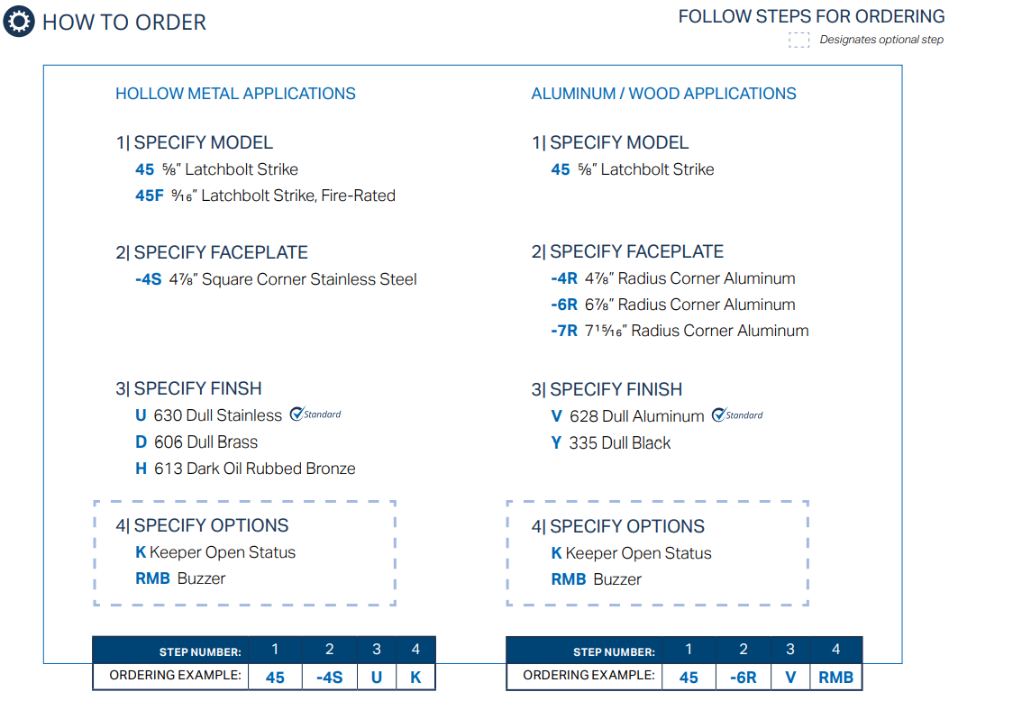 45F models are fire-rated and accept 9/16” throw latchbolts or up to 5/8” throw latchbolts with 1/8” door gap.