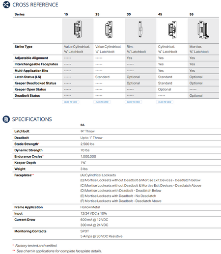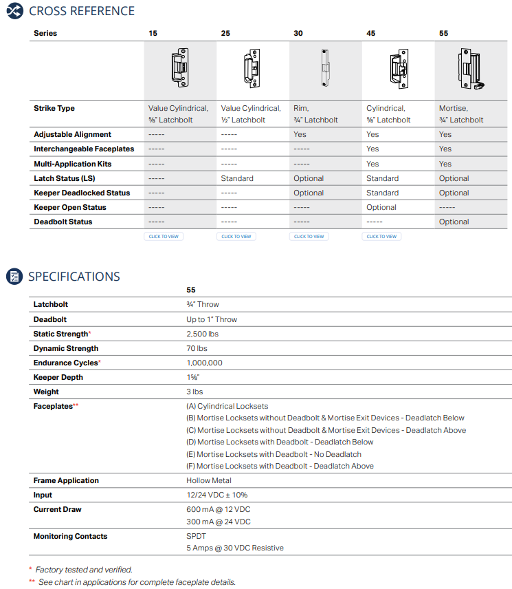 SDC’s 55 series 3/4” latchbolt electric strikes are heavy duty, designed for installation in hollow metal frames for access control of cylindrical locksets, mortise locksets with or without deadbolts and mortise exit devices. 55 series strikes accept 3/4” throw latchbolts and up to 1” throw deadbolts.