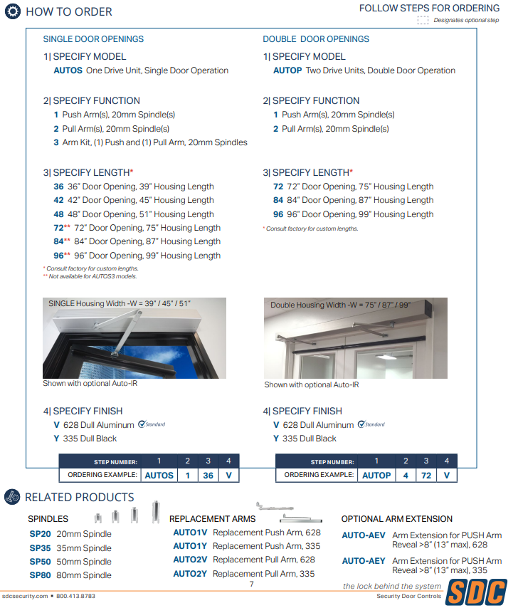 SDC’s operator is built with a state-of-the-art microprocessor-based unit that is self-tuning and self-learning while offering nonhanded operation, full-mechanical stops, and a variety of interface options for sensors, push-plates, fire alarms and electrified locks.