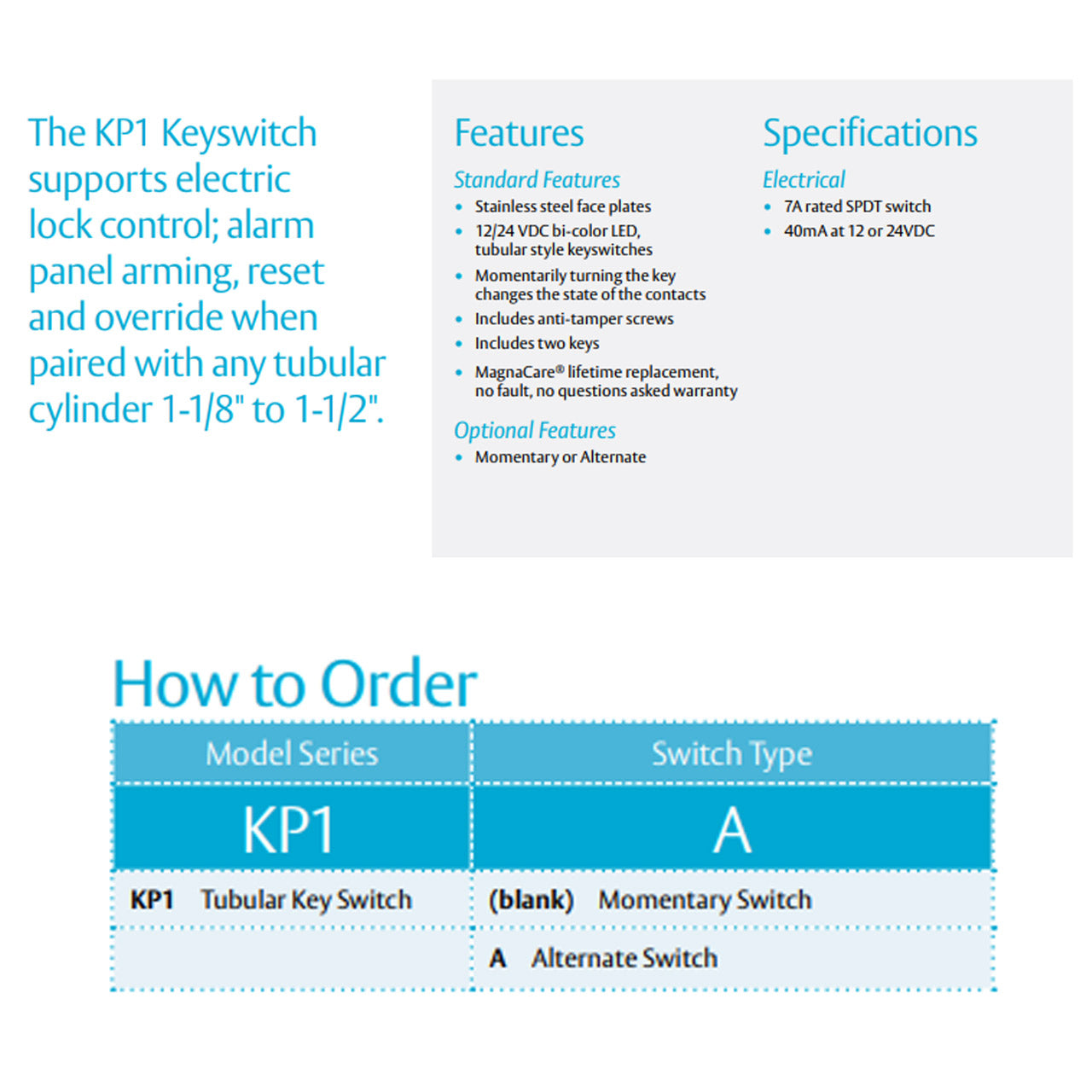 Supports electric lock control; alarm panel arming, reset and override. The KP1 Keyswitch supports electric lock control; alarm panel arming, reset and override when paired with any tubular cylinder 1-1/8" to 1-1/2".