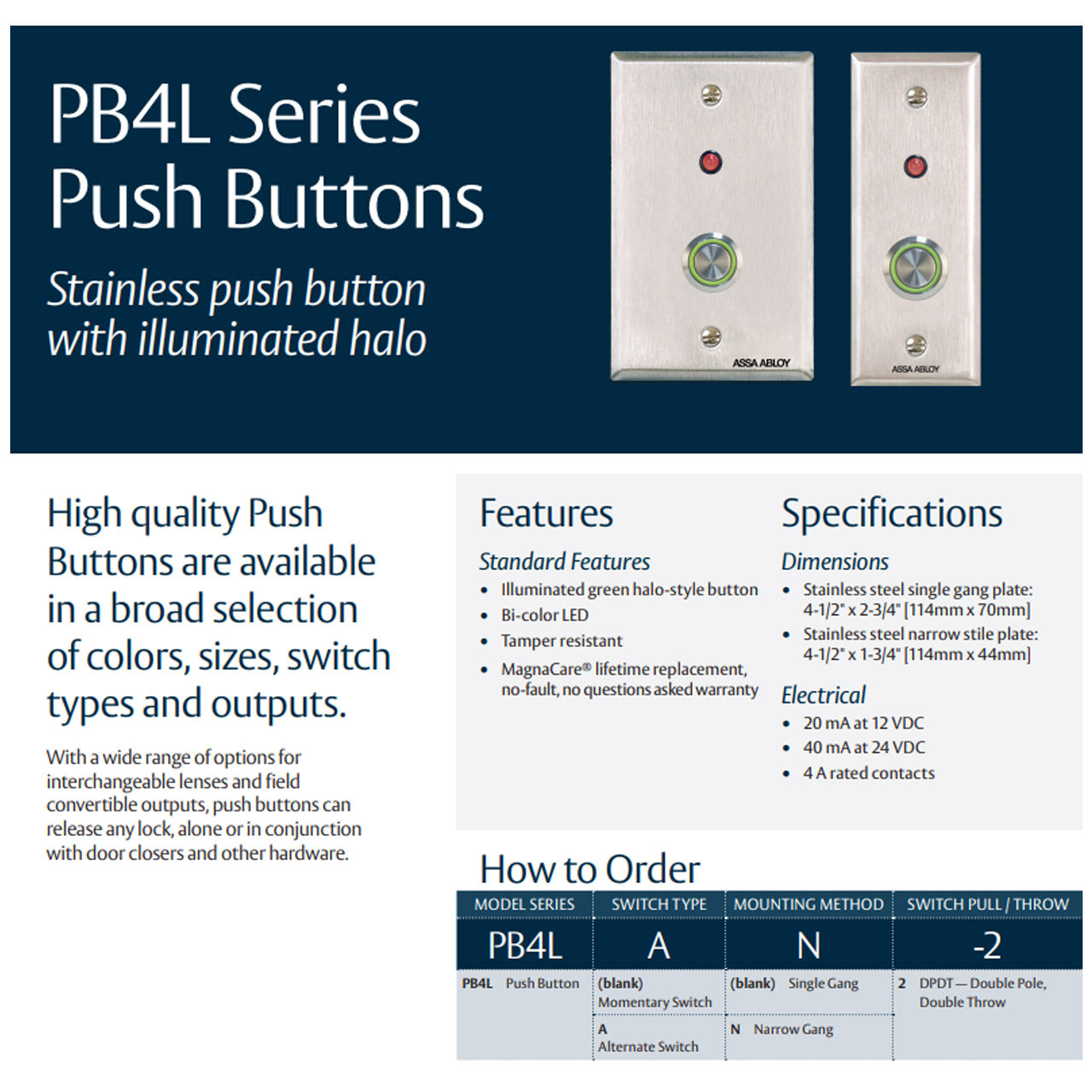 High quality Push Buttons are available in a broad selection of colors, sizes, switch types and outputs. With a wide range of options for interchangeable lenses and field convertible outputs, push buttons can release any lock, alone or in conjunction with door closers and other hardware.