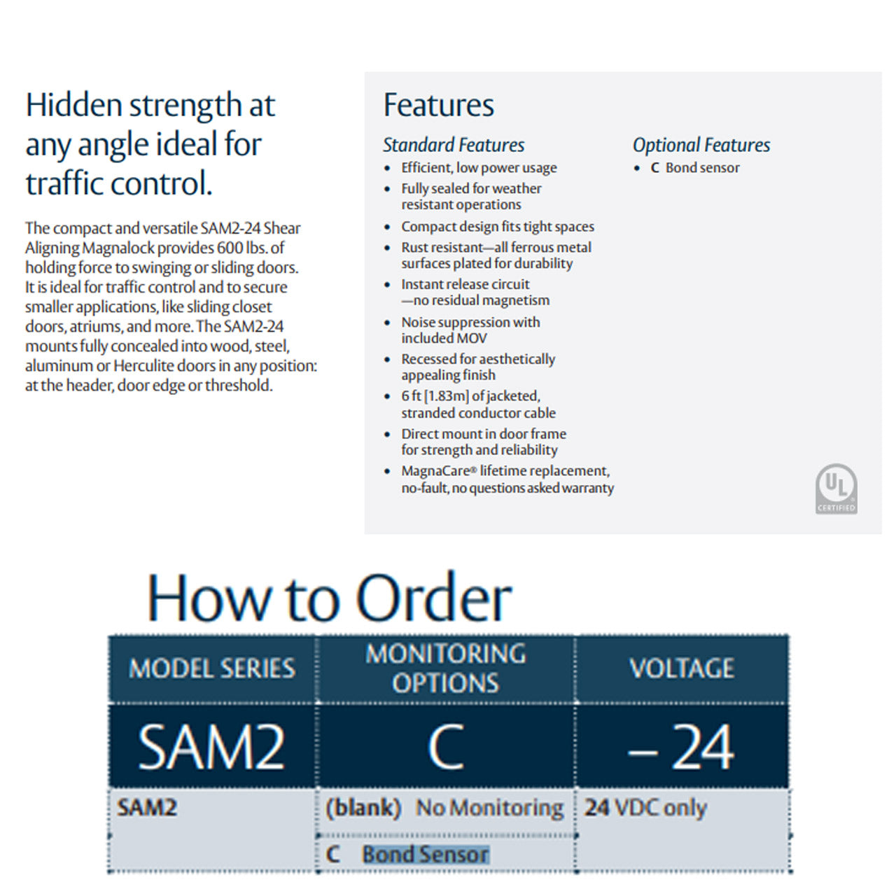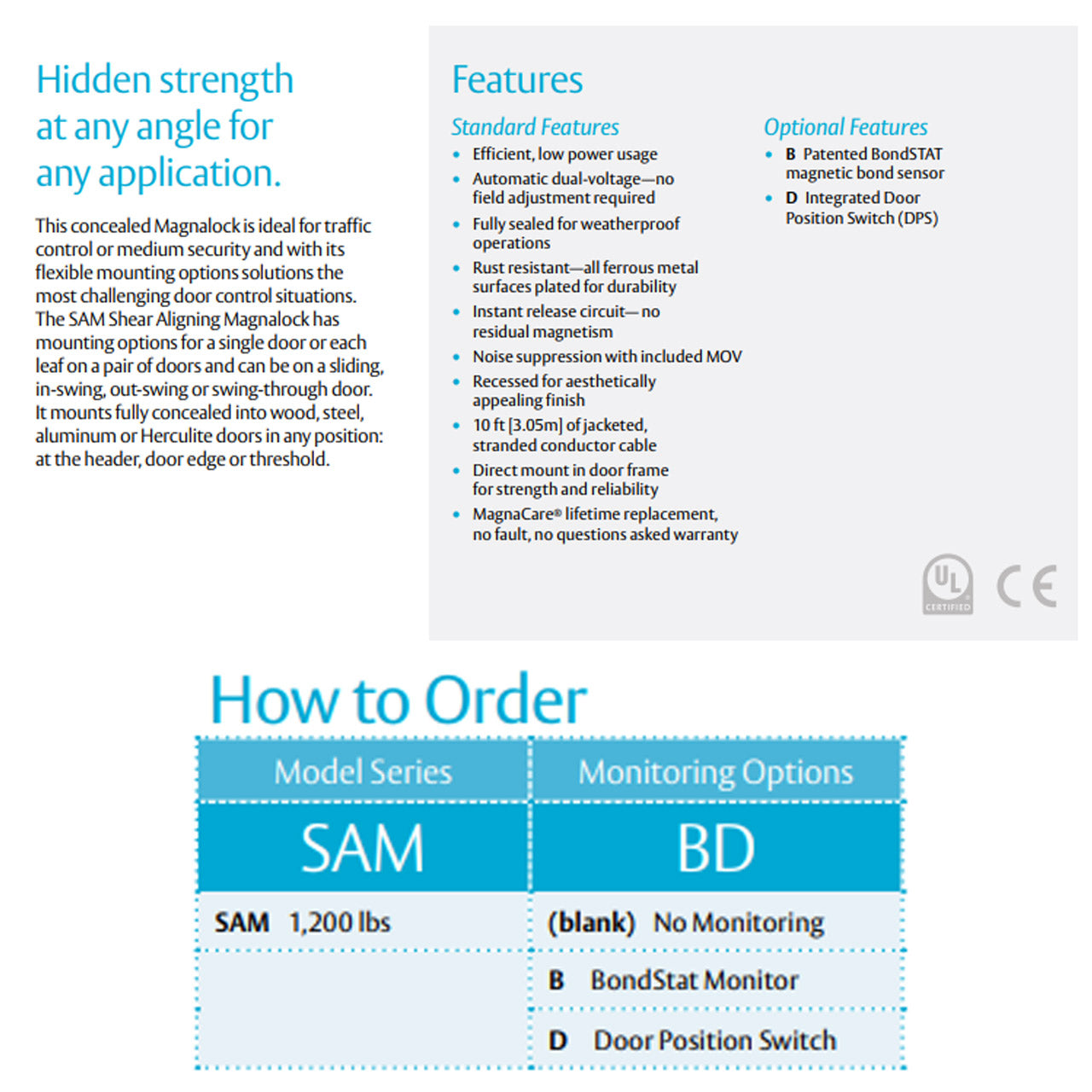 - Lock options include BondSTAT magnetic bond sensor and integrated door position switch