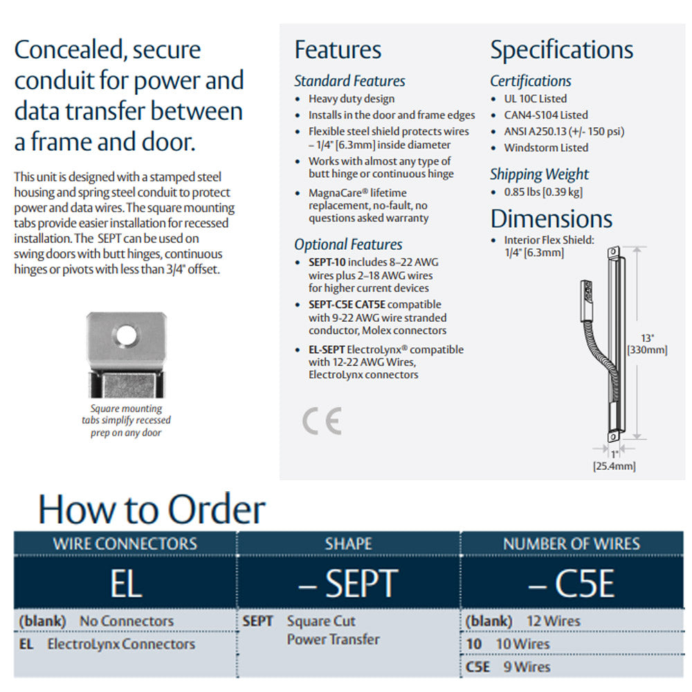 Concealed, Tamper-resistant, Flexible Power and Data Transfer. Concealed, secure conduit for power and data transfer between a frame and door. This unit is designed with a stamped steel housing and spring steel conduit to protect power and data wires. The square mounting tabs provide easier installation for recessed installation. The SEPT can be used on swing doors with butt hinges, continuous hinges or pivots with less than 3/4" offset.
