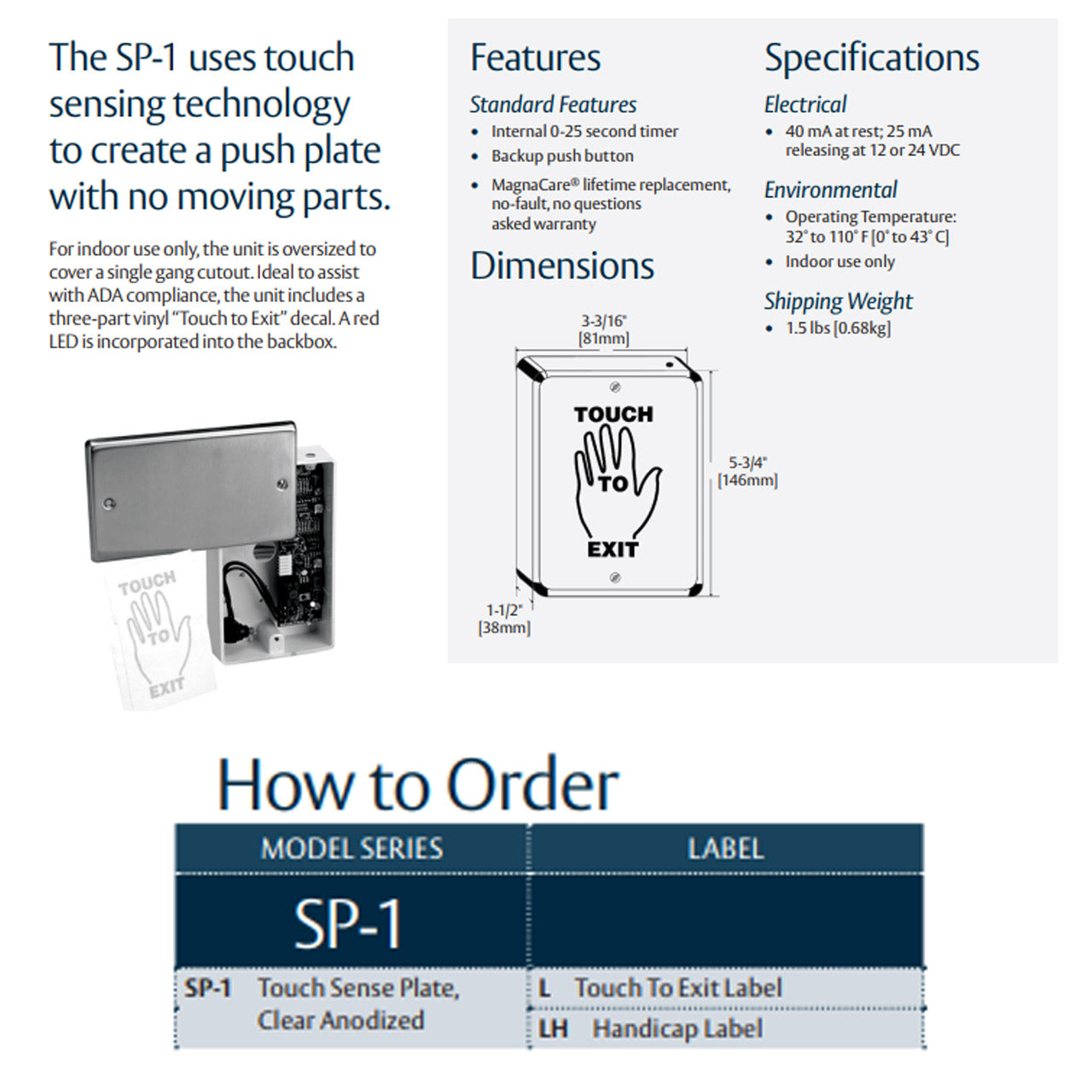 DESCRIPTION TAG: The SP-1 uses patented touch sensing technology to create a push plate with no moving parts.