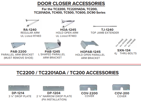 The TC400/500 are recommended for use on commercial, architectural and institutional applications. These models are ideal for business, new construction and renovations. Both models have a full selection of accessories to accommodate the requirements of any door control installation. Fully compliant with opening force requirements for ADA and ANSI/BHMA standards.