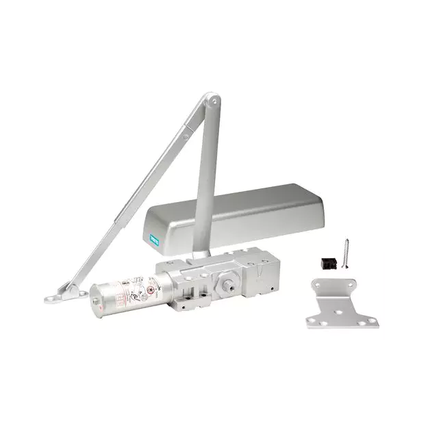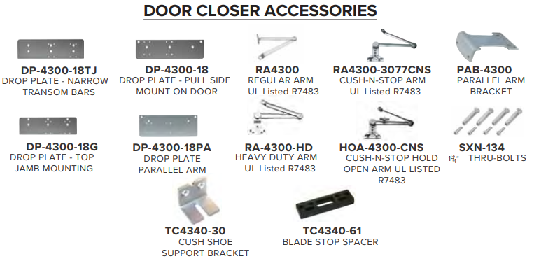 The TC4300 has all the same design features and specifications as our TC4361 and is our heaviest duty closer for institutional and all other high traffic demanding applications. It has a wide choice of options and installation accessories to accommodate the requirements specified in any industrial or institutional environment. This model comes tri-packed standard and can be ordered with different arm styles for maximum versatility. Fully compliant with opening force requirements for ADA and ANSI/BHMA standards. Meets ADA Requirements. Grade 1 Certified, ANSI/BHMA A156.4 Options: Specify when ordering Hold open cush – HOA Cush arm – CNS Heavy duty – HD Finish – AL, DU Specifications: Grade 1 certified, ANSI/BHMA A156.4 UL Listed #R7483 (mfg. 5300 series) complies with UL10C for positive pressure Aluminum alloy shell Non-handed – full cover Multi-size springs 1-6 adjustable power ADA compliant Three independent regulating valves – control sweep and latch closing speeds, also backcheck cushion Tri packed- regular, top jamb, parallel arm Supplied with both wood and machine screws Finish: AL- Aluminum, DU- Duronotic