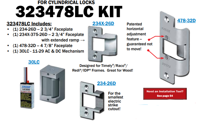 The 323478LC electric strike includes the 234X Faceplate in addition to the current faceplates already included Trine Solution. With the Patented horizontal adjustment feature -- Guaranteed not to move -- and the Smallest electric strike faceplate in the world, this 3000 Series strike is your universal ANSI solution. (478-CCFP is no longer included in the 323478LC-32D)