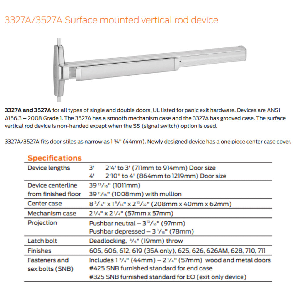Von Duprin 3327A/3527A-EO Series Surface Mounted Vertical Rod Exit Device. 3327A and 3527A for all types of single and double doors, UL listed for Panic Exit Hardware. Devices are ANSI A156.3 – 2001 Grade 1. The 3527A has a smooth mechanism case and the 3327A has grooved case. The surface vertical rod device is non-handed except when the SS (Signal Switch) option is used.