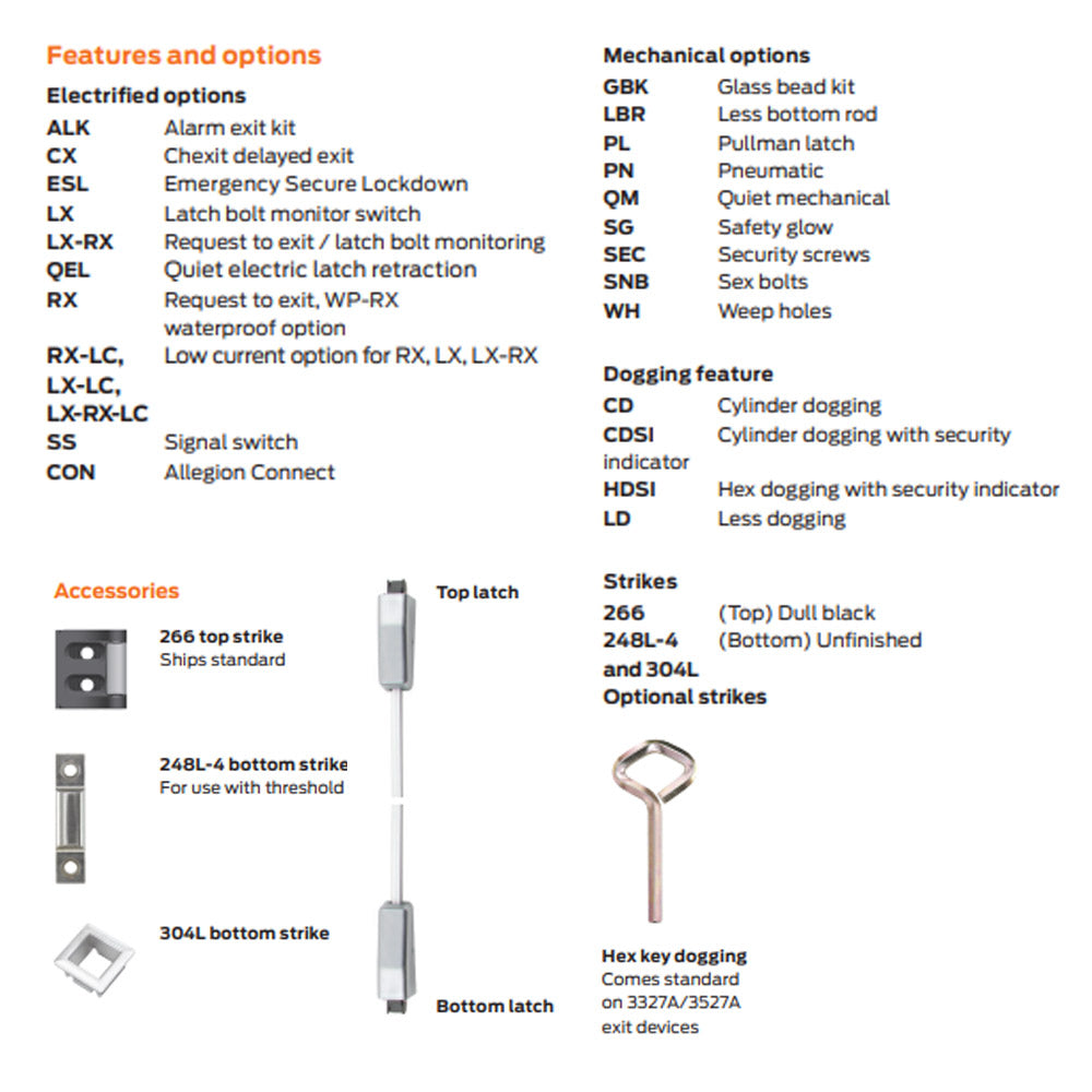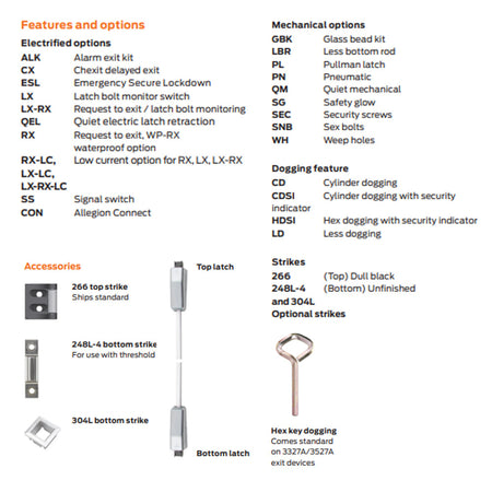 • Electric Options: LX Latchbolt Monitor Switch; RX Pushpad Monitor Switch; RX2 Double Pushpad Monitor Switch; SS Signal Switch; EL Electric Latch Retraction; ALK Alarm Exit Kit