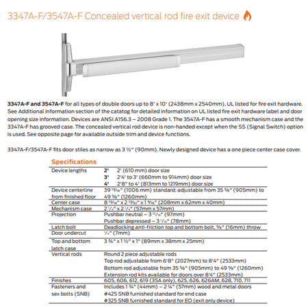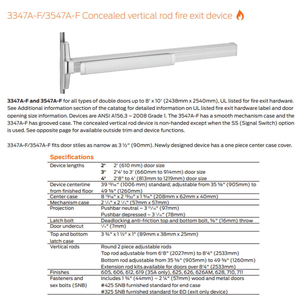 Von Duprin 3347A-EO-F/3547A-EO-F Series Fire Exit Concealed Vertical Rod Device. 3347A-F and 3547A-F for all types of double doors up to 8’ x 10’ (2438mm x 2540mm), UL listed for Fire Exit Hardware. Devices are ANSI A156.3 – 2001 Grade 1. The 3547A-F has a smooth mechanism case and the 3347A-F has grooved case. The concealed vertical rod device is non-handed except when the SS (Signal Switch) option is used.
