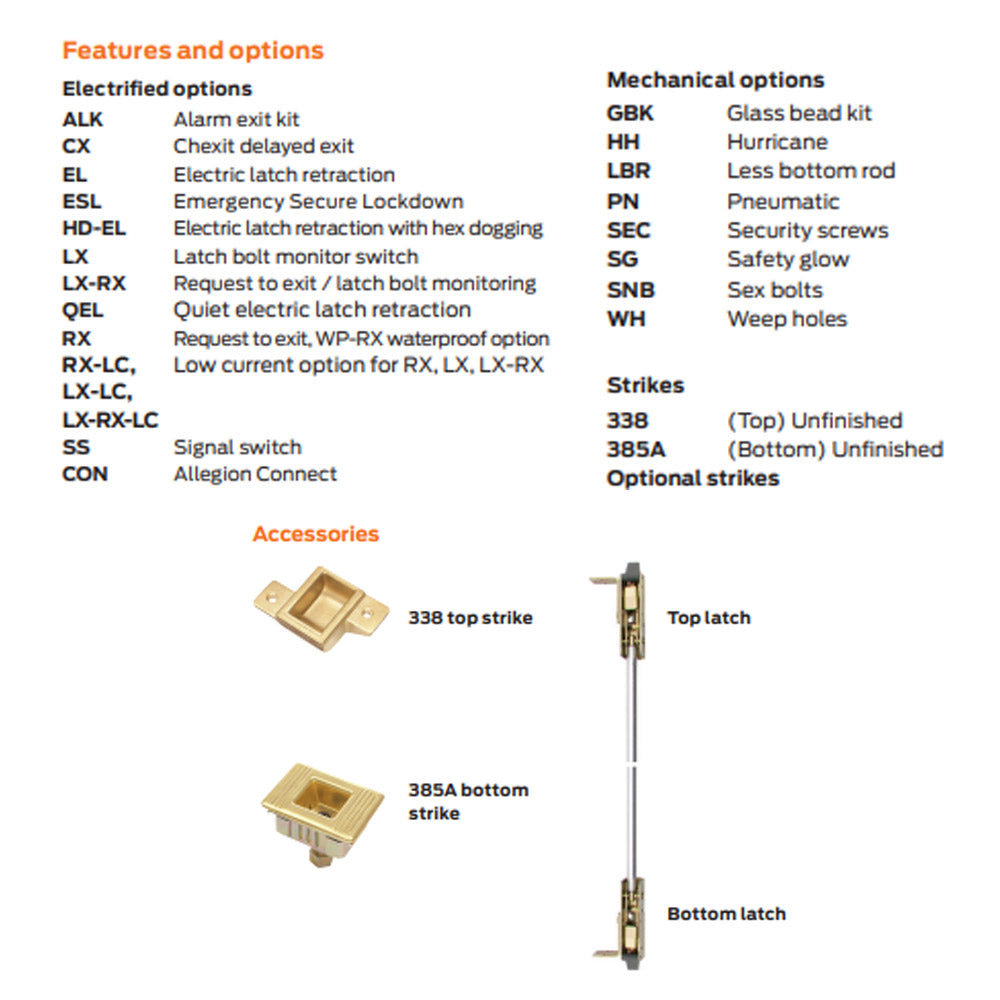 - Dogging Feature: No mechanical Dogging, EL option available; Electric Options LX Latchbolt Monitor Switch; RX Pushpad Monitor Switch; RX2 Double Pushpad Monitor Switch; SS Signal Switch; EL Electric Latch Retraction; ALK Alarm Exit Kit