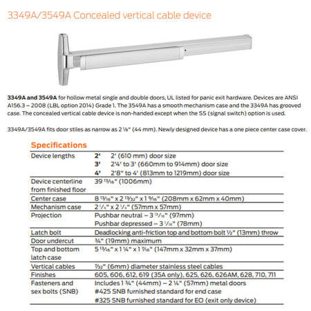 Ideal for high-security and commercial settings, the 3349AEO-F includes stainless steel 7/32" (6mm) diameter vertical cables, making it a durable solution for fire-rated doors requiring concealed hardware.