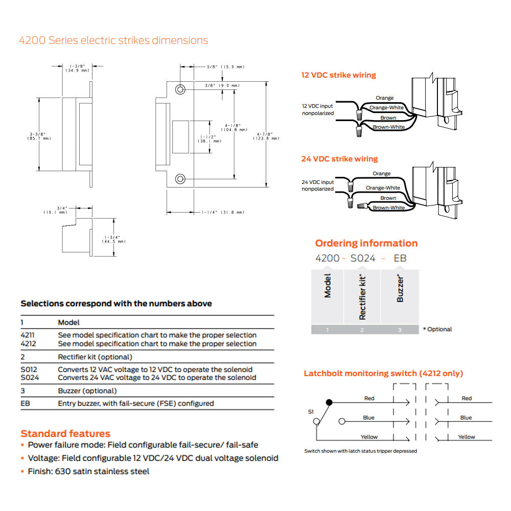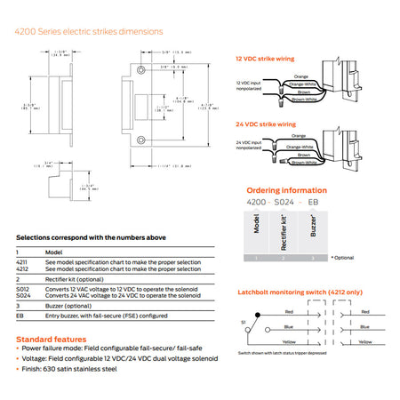 The 4200 Series is ideal for interior commercial traffic control with cylindrical applications. It is designed for easy installation with a dual-voltage internal solenoid and field-configurable power failure mode that can be changed without disassembly. Two models are available with or without latchbolt monitoring.