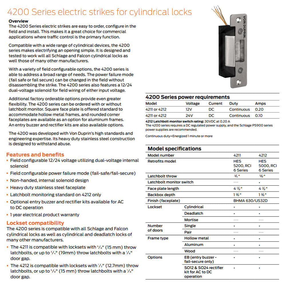 The 4200 Series is compatible with a wide range of cylindrical locks including Schlage, Falcon, and many other manufacturers. Additionally, the series is part of a versatile portfolio of electric door strikes designed to save installers time and money.