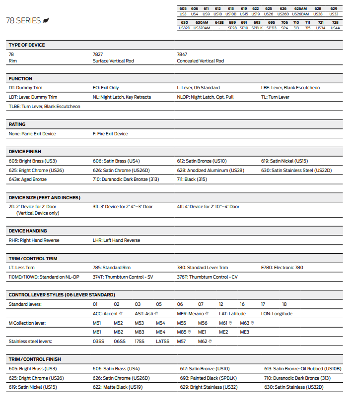 The 78 Series is available less trim (LT) and several versions of the exit trim models listed below: