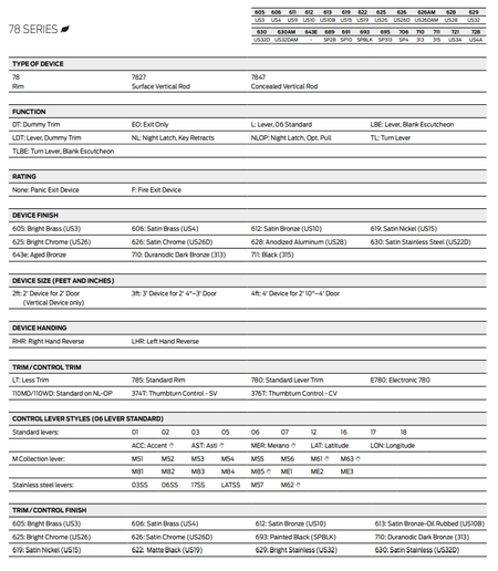 The 78 Series offers a solution for most single, double and double egress door applications. Below are the available device types: