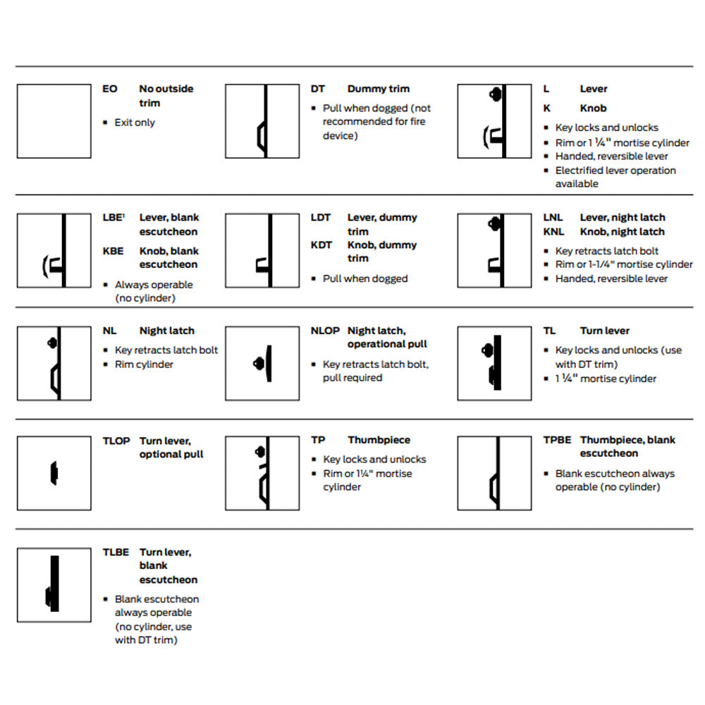 • E – Electric unlocking (for mortise devices with BE trim); allows integration with access control, fire alarm systems, or remote switches.