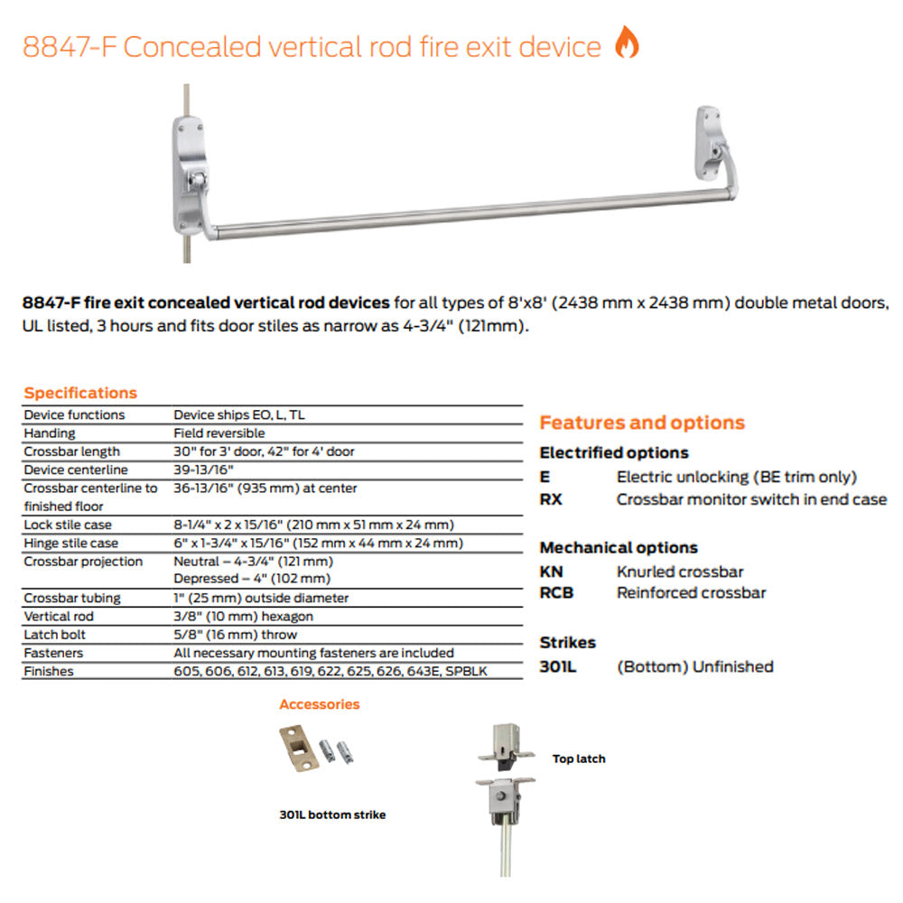 Von Duprin 8847EO-F Concealed vertical rod fire exit device 88 Series