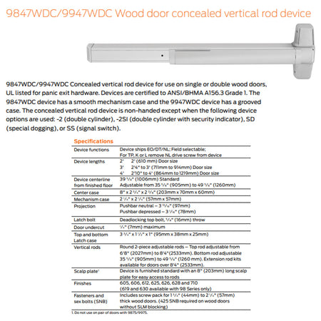 Designed for single or double wood doors, the 9847/9947 Concealed Vertical Rod Device is a high-performance exit solution that meets UL listing for Panic Exit Hardware. Built for durability and security, it is certified to ANSI/BHMA A156.3 Grade 1, ensuring top-tier performance in commercial and industrial settings.