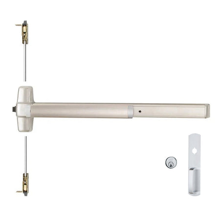This surface-mounted vertical rod exit device is designed for all types of single or double doors, UL listed for panic exit hardware. Featuring a three-point latching system, it includes a center case latch along with top and bottom latches for secure and reliable door locking.