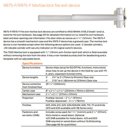 The Von Duprin 9875 and 9975 mortise lock exit devices are designed for single or double doors, offering reliable security with UL listing for panic exit hardware. Built to meet ANSI A156.3-2001 Grade 1 standards, these devices ensure top-level durability and performance.